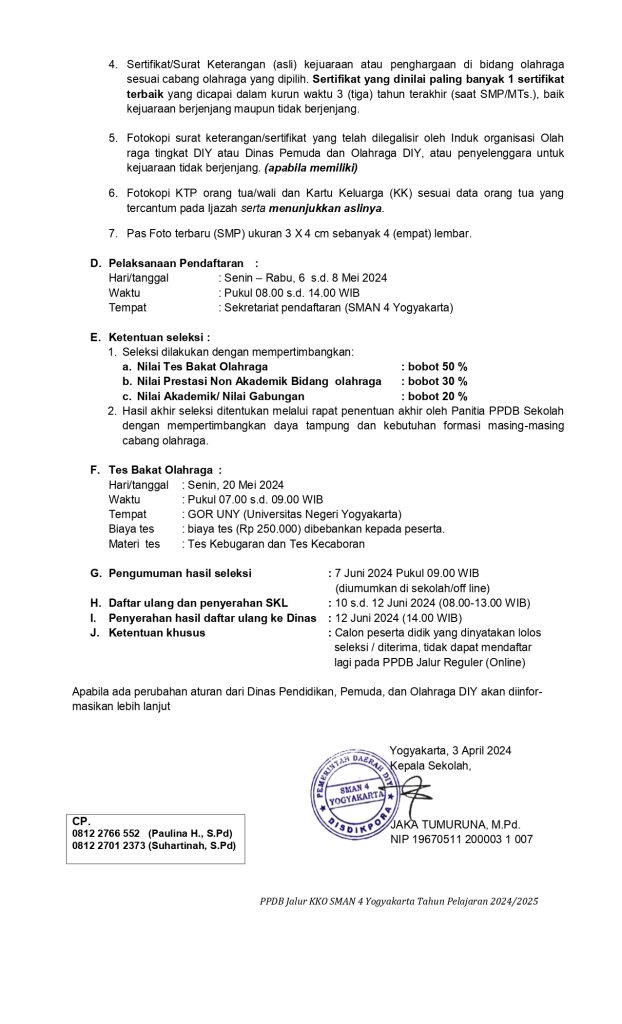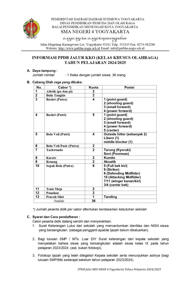 Informasi PPDB Kelas Khusus Olahraga (KKO) 2024-2025 9 April 20246 May 2024 Patbhe Jogja Pedoman Seleksi PPDB KKO bisa di download di link dibawah ini :Pedoman Seleksi Penerimaan Peserta Didik Baru KKO